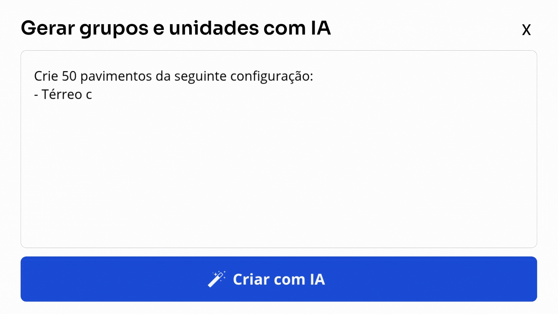 Com base no seu prompt, o Averba.me cria automaticamente a estrutura de pavimentos, unidades e tipologias — agilizando o início da incorporação e garantindo consistência entre os dados.
