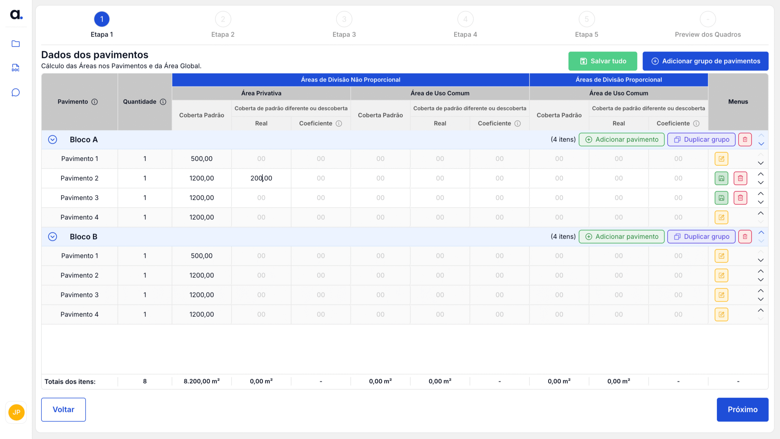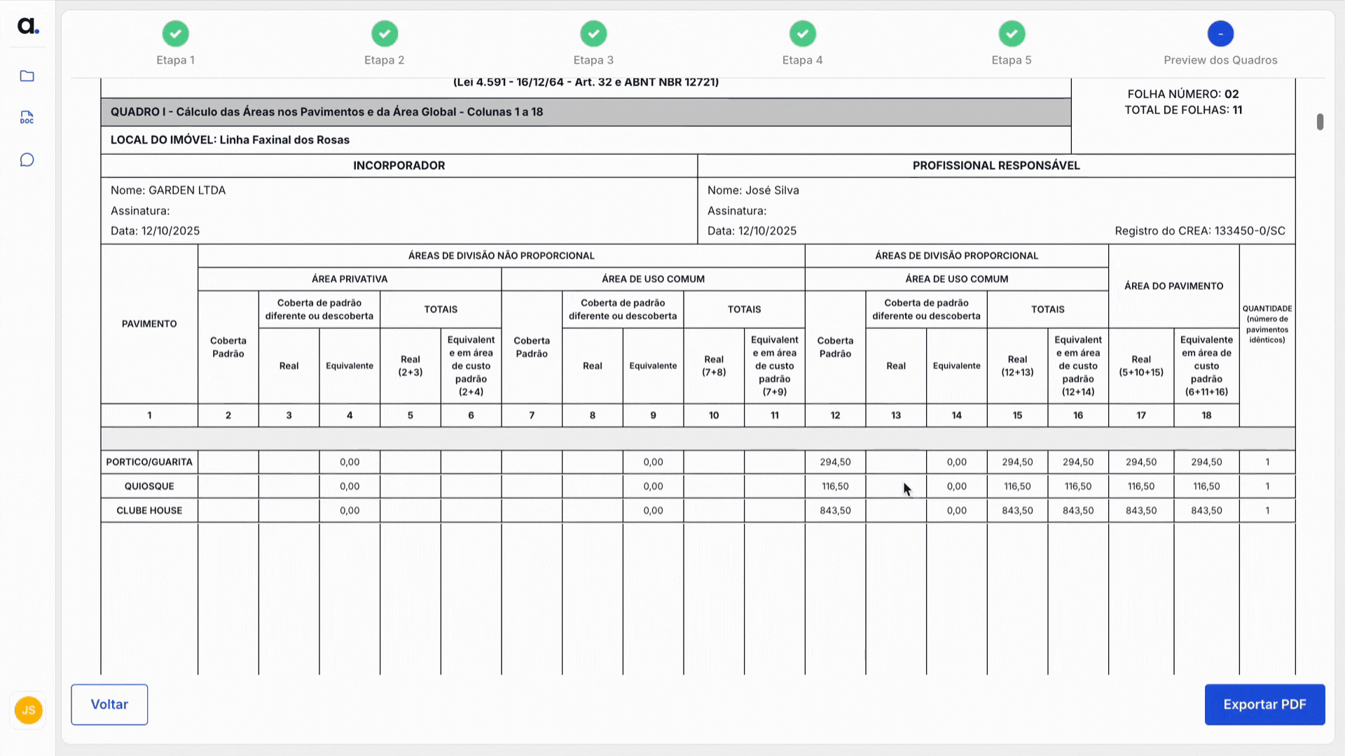 Gere todos os quadros exigidos pela NBR 12.721 com base nos dados preenchidos na plataforma. O Averba.me organiza, calcula e formata automaticamente os quadros em conformidade com a norma — prontos para serem baixados em PDF e incluídos no processo de incorporação.